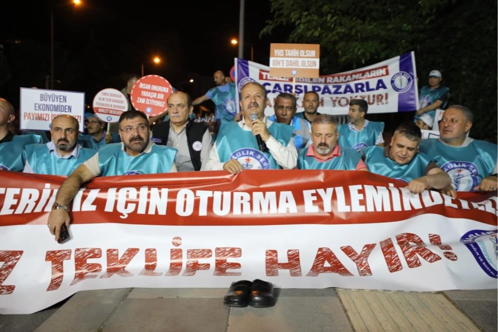 Burada konuşan Sağlık-Sen Genel Başkanı Mahmut Faruk Doğan, "Kamu işveren heyeti bugün bir teklif daha verdi. Tabii bu teklifi de biz reddediyoruz. Çünkü bu teklifin de çarşıyla, pazarla hiçbir şekilde alakası yok. Kamu işveren heyeti, ‘Meseleleri mesele etmezseniz ortada mesele kalmaz' anlayışıyla hareket etmekte, sahanın sesine kulak vermemektedir. Biz, kamu işvereninin memurun geçim derdini kendine mesele etmesini istiyoruz. Biz hakkımızı istiyoruz. Biz alın terimizin karşılığını istiyoruz. Biz adil, hakkaniyetli bir teklif istiyoruz" dedi.
