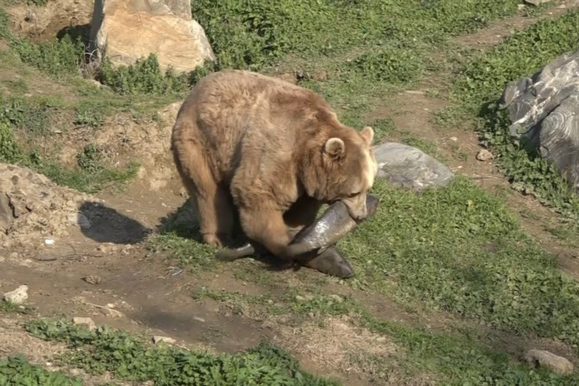 Bakıcılar tarafından 2 boz ayı için 2 tane 9 kiloluk levrek alanlarına bırakıldı. Balıkların kokusunu alan ayılar, biran önce yemek için harekete geçti. İlk önce balıklara ulaşan ayı, 9 kiloluk levreği, diğer balığın yayına taşıdı. İkisini de kendisi yemek için plan yapsa da, 18 kiloyu biranda ağzıyla kavrayamayan ayı, birini bırakmak zorunda kaldı. Balıkları alan ayılar, güneşli havada mideleri bayram etti.