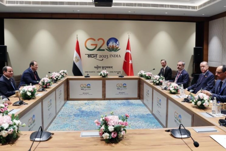 Cumhurbaşkanı Recep Tayyip Erdoğan, 18’inci G20 Liderler Zirvesi dolayısıyla bulunduğu Hindistan’ın başkenti Yeni Delhi’de, Zirve’ye özel davetli olarak katılan Mısır Cumhurbaşkanı Abdulfettah es-Sisi ile görüştü. İki lider görüşmede, Türkiye - Mısır ikili ilişkileri, ticaret hacminin artırılması, enerji alanındaki yeni iş birlikleri ile bölgesel ve küresel meseleleri ele aldı. Cumhurbaşkanı Erdoğan, karşılıklı büyükelçi atamalarıyla ilişkilerin yeni bir döneme girdiğine işaret ederek, ikili münasebetlerin hak ettiği seviyeye en kısa zamanda ulaşacağına olan inancını dile getirdi. Mısır yönetiminin Türk yatırımcı ve firmalarına verdiği desteğin önemli olduğunu vurgulayan Cumhurbaşkanı Erdoğan, LNG, nükleer enerji, kültür ve eğitim alanlarındaki iş birliğini canlandırmaya da önem verdiklerinin altını çizdi. Dışişleri Bakanı Hakan Fidan, MİT Başkanı İbrahim Kalın, İletişim Başkanı Fahrettin Altun, Cumhurbaşkanı Dış Politika ve Güvenlik Başdanışmanı Akif Çağatay Kılıç ve Cumhurbaşkanı Başdanışmanı Sefer Turan da görüşmede hazır bulundu.