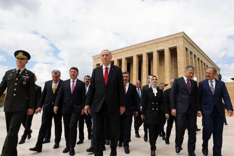 Cumhurbaşkanı Recep Tayyip Erdoğan, yeni Kabine üyeleriyle birlikte Anıtkabir’i ziyaret etti. Aslanlı Yol'dan yürüyerek Atatürk'ün mozolesine çıkan Erdoğan'a, Cumhurbaşkanı Yardımcısı Cevdet Yılmaz, Adalet Bakanı Yılmaz Tunç, Aile ve Sosyal Hizmetler Bakanı Mahinur Özdemir Göktaş, Çalışma ve Sosyal Güvenlik Bakanı Vedat Işıkhan, Çevre, Şehircilik ve İklim Değişikliği Bakanı Mehmet Özhaseki, Dışişleri Bakanı Hakan Fidan, Enerji ve Tabii Kaynaklar Bakanı Alparslan Bayraktar, Gençlik ve Spor Bakanı Osman Aşkın Bak, Hazine ve Maliye Bakanı Mehmet Şimşek, İçişleri Bakanı Ali Yerlikaya, Kültür ve Turizm Bakanı Mehmet Nuri Ersoy, Millî Eğitim Bakanı Yusuf Tekin, Millî Savunma Bakanı Yaşar Güler, Sağlık Bakanı Fahrettin Koca, Sanayi ve Teknoloji Bakanı Mehmet Fatih Kacır, Tarım ve Orman Bakanı İbrahim Yumaklı, Ticaret Bakanı Ömer Bolat, Ulaştırma ve Altyapı Bakanı Abdulkadir Uraloğlu, Cumhurbaşkanlığı İletişim Başkanı Fahrettin Altun, Cumhurbaşkanlığı Özel Kalem Müdürü Hasan Doğan da eşlik etti.