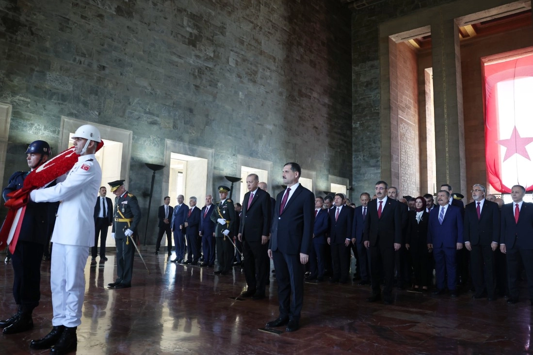 Cumhurbaşkanı Erdoğan, Atatürk’ün mozolesine ay yıldız motifli çelenk bıraktı. Saygı duruşunun ardından İstiklal Marşı okundu. Cumhurbaşkanı Erdoğan ve protokolde yer alan devlet erkanı, daha sonra Misak-ı Milli Kulesi’ne geçti. Anıtkabir Özel Defteri’ni imzalayan Cumhurbaşkanı Erdoğan, deftere şunları yazdı:
