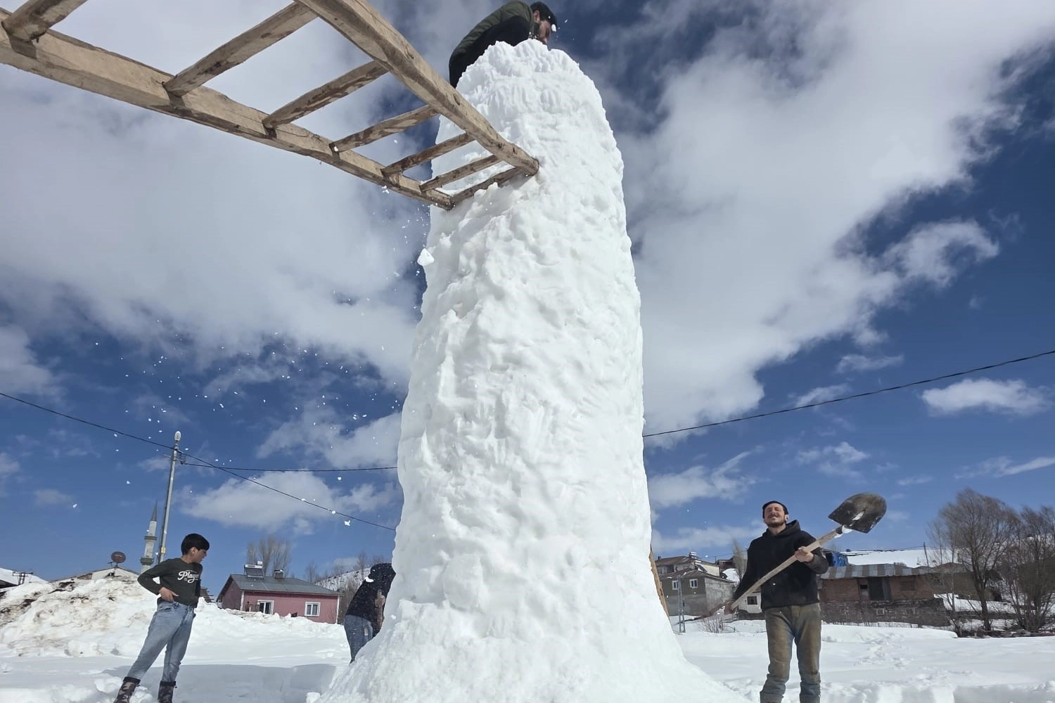 Yıldızeli ilçesine bağlı Geynik köyünde yoğun kar yağışının ardından biriken karlar, ilginç bir çalışmaya sahne oldu. Köyde yaşayan Yakup Aydın, çocukları ve arkadaşlarının da desteğiyle, iskele kullanarak sadece bir gün içerisinde yaklaşık 8 metre yüksekliğinde dev bir kardan adam yaptı. Günlerdir etkili olan kar yağışının ardından beyaza bürünen köyde ortaya çıkan dev kardan adam, görenlerin ilgisini çekti. Köy halkı ve çocuklar yapılan kardan adamın etrafında hatıra fotoğrafı çektirirken, ortaya çıkan görüntüler renkli anlara sahne oldu. Hedefi 14 metreydi, iskele yetmedi Yakup Aydın, iskele kullanarak kardan adamı yaptıklarını belirtip, "Çocuklarla köye gittik, köyde çok fazla kar yağmıştı, öyle bir kardı ki yaklaşık 10 çatı çökmüştü ve kar 1 metrenin üzerindeydi. Çocuklarla kardan adam yapmak aklımıza geldi, kardan adama başladık, yükseldi ama merdivensiz olmadı, önce dört metrelik merdiven getirdik, o da yetmedi, daha sonra yedi metrelik merdiven aldık. Kar çıkarmak çok zor oldu, iplerle kovalarla tepesine kar taşıdık ve kardan adamı yükselttik. Hedefimiz 14 metreydi ama zaman yetmedi. Herkes fotoğraf çekildi, büyük bir ilgi odağı oldu, bu da bizi çok mutlu etti" dedi.