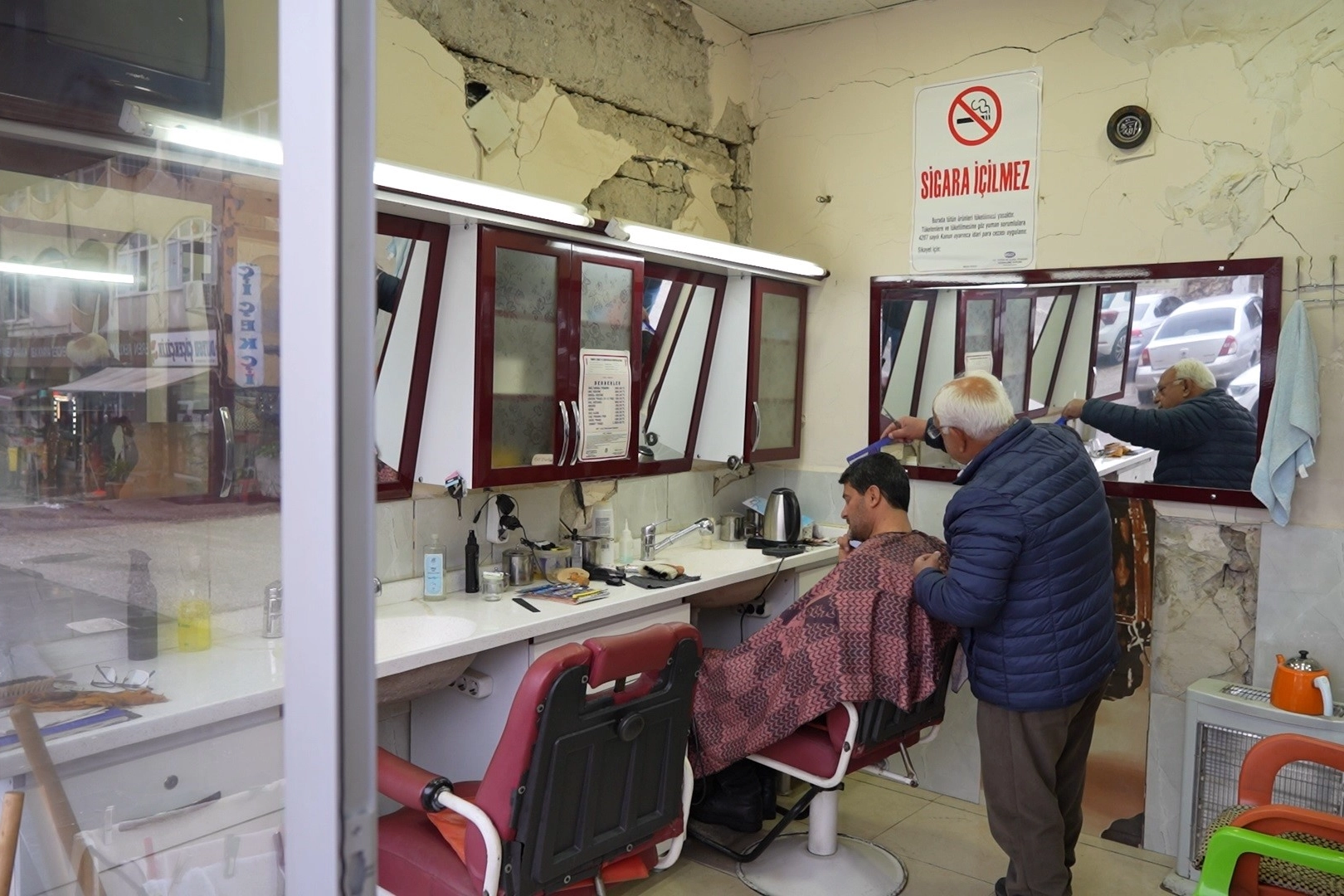 Kahramanmaraş merkezli 6 Şubat 2023'te yaşanan depremlerde 65 yaşındaki Cuma Demir’in 25 yıldır çalıştırdığı berber dükkanı da hasar gördü. Cuma Demir’in berber dükkanının bulunduğu Cumhuriyet Mahallesi’nde onlarca bina ve iş yeri yıkıldı. 44 yıldır geçimini sağladığı berber dükkanı hasar gören Cuma Demir, etrafındaki tüm bina ve iş yerleri yıkılmasına rağmen depremin derin ve unutulmaz izlerini taşıyan mahallesini ve iş yerini terk etmedi. Deprem sonrası ayakta kalan iş yerini terk etmedi Deprem sonrası yıkılan binaların arasında ayakta kalan eski iş yerinde depremin duvarda oluşturduğu izlerin bir kısmını kendi imkanlarıyla sıva yaparak kapatmaya çalışan Demir, depremin neden olduğu izlerin halen durduğu iş yerinde mesleğini sürdürmeye çalışıyor. Depremde birçok yakınını da kaybeden Demir, doğup büyüdüğü ve çok sevdiği ilçesini terk etmeyerek 3 yıldır depremin izlerinin durduğu iş yerinde kendisi gibi depremzede müşterilerine hizmet etmeye devam ediyor ve yıkıcı depremlerde onlarca binanın yıkıldığı mahallede tek başına da kalsa ayakta durmaya çalışıyor. Büyük yıkıma rağmen pes etmeyerek ve mesleğinden vazgeçmedi Yıkılan binaların ortasında kalan iş yerini her gün düzenli olarak açan Demir, büyük yıkıma rağmen pes etmeyerek ve mesleğinden vazgeçmeyerek 50 yıllık mesleğini sürdürüyor. Çırak olarak başladığı berberliği yaklaşık 50 yıldır sürdürdüğünü belirten Demir, ustalığı süresince 2 dükkan değiştirdiğini ve 2001'den bu yana da Cumhuriyet Mahallesi’ndeki küçük iş yerinde hizmet verdiğini söyledi. "Depremlerde iş yerimde küçük hasarlar oluştu" 2001 yılından beri ailesinin geçimini sağladığı ve yıllardır ilçedeki müşterilerine hizmet verdiği berber dükkanından vazgeçemediğini belirten Demir, "Depremlerde iş yerimizde bazı küçük hasarlar oluştu. Hasarların oluştuğu ve depremin izlerinin durduğu iş yerimde mesleğime çok şükür devam ediyorum. Devletimizden ve milletimizden de Allah binlerce kez razı olsun. Bize kol kanat gerdiler. Devlet bizi mağdur etmedi. Dükkanımızda çalışıyoruz. Dükkanım için yıkım kararı verilinceye ve bize yeni bir iş yeri yapılıncaya kadar bu dükkanda çalışmaya devam edeceğim. O zaman bizi buradan çıkarırlarsa bir şey diyemeyiz" dedi. "Bu dükkanda hatıralarım ve emeğim var" Depreme rağmen ayakta durmaya çalıştığını belirten Demir, "Müge Sitelerinde yeğenlerim ve küçük çocukları enkaz altında kalarak hayatlarını kaybetti. Evleri tamamen yıkıldı. Tabi bazı yakınlarımızda depremden dolayı travma geçirdi. 25 yıldır ben bu dükkandayım. Dükkanımızda hasarlı olduğu halde mesleğimi sürdürüyorum. Çünkü yıllardır ailemin geçimini ben dükkanda sağladım. Bundan dolayı da bırakıp gidemiyorum. Fakat bize yeni bir yer verilirse oraya taşınırım. Ben dükkanda kiracıyım ama ne kadar kiracı da olsam yıllardır bu dükkanda esnaflık yaptım ve bırakıp gidemiyorum. Çünkü buraya alışmışım. Çünkü benim bu dükkanda hatıralarım ve emeğim var. Benim bu dükkandan da başka bir gelirim yoktur. Benim ömrüm bu dükkanda geçti. İslahiye benim ilçemdir, vatanımdır. Kimse vatanını bırakıp gidemez. Her şeyim burada ve burayı bırakıp gidemem" diye konuştu.