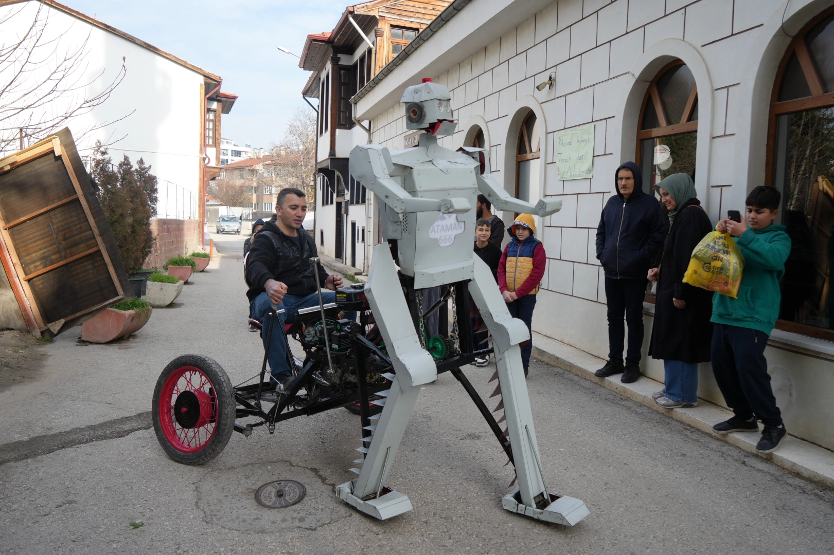 Kastamonu'da bir fabrikada 15 yıldır, üretim operatörü olarak çalışan Osman Demircioğlu, hurda malzemeleri kullanarak insan taşıyan robot tasarladı. Hurda bir motosikletin motorunu, başka bir motosikletin tekerleklerini ve hurdadan topladığı malzemeleri kullanan Osman Demircioğlu, yaklaşık 4 yıl süren çalışmasının ardından yürüyebilen ve arkasındaki tekerlekli kısımda insan taşıyabilen robot yaptı. Osman Demircioğlu'nun, "Ataman 666" ismini verdiği robotu sokakta gören vatandaşlar ise şaşırıyor. Farklı bir tasarım yapmak istediği için robotu yaptığını belirten Demircioğlu, projelerine devam etmek istediğini söyledi. "Yaklaşık 4 yıl bir sürede tamamlandı" Robotun tasarımına çizim yaparak başladığını ifade eden Demircioğlu, "Çocukların ilgisini çekecek bu robotu tasarladım. Daha önce bunun oyuncağını yapmıştım, geliştirerek üzerinde bir insan taşıyabilecek şekle getirdim. İlk önce kağıt üzerinde çizimini yaptım, adım atma formülünü hesapladım. Hurdalardan malzemeler temin ettim. Bir hurda motosikletin motorunu, başka bir motosikletin tekerleklerini kullandım. Çizimlerini yapıp tasarımını yaptım ve yürümesini gerçekleştirdim. Yaklaşık 4 yıl bir sürede tamamlandı" dedi. "Bütün tasarımı ve montajı bana ait" Amacının farklı bir şey tasarlamak olduğu için robotu yaptığını belirten Demircioğlu, "Küçüklükten beri makinelere ilgim vardı. Değişik bir şey yapmak istedim. Hobi olarak da bu işleri yapıyordum ve bu şekilde başladım. İnsanlarımız da ilgi gösterdiler. Ben de elimden geldiği kadar anlattım. Yapım aşamasında eşimin ve çocuklarımın da büyük desteğini gördüm. Sanayiden de destek aldım. Genel itibarıyla bütün tasarımı ve montajı bana ait" diye konuştu. "Böyle bir şey görmedikleri için merak ediyorlar" ? Herkesin yaptığı robota büyük ilgi gösterdiğini kaydeden Demircioğlu, gençlere çağrıda bulunarak, "Maliyeti yaklaşık 15 bin ila 20 bin arasında. Amacım Kastamonu’da bulunmayan elektrikli fayton yapmak. Bu çocuklardan büyük ilgi görüyor. Daha önce hayatlarında böyle bir şey görmedikleri için merak ediyorlar. Bundan sonra projelerime devam etmek istiyorum. İlk olarak elektrikli fayton yapmak istiyorum. Gençlere de tavsiyem, sosyal medyaya kendilerini fazla kaptırmadan gerçek hayatla ilgilenmeleri olacak" şeklinde konuştu.