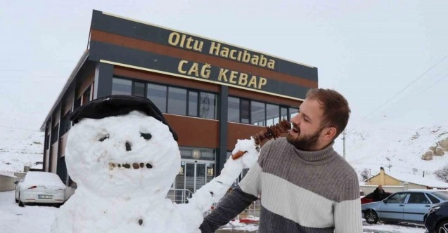 Cağ kebabı restoranı işletmecisi, iş yerine ilgi çekmek için kardan adamın eline cağ kebabı tutuşturdu. Cağ kebaplı kardan adam vatandaşların ilgisini çekerken, görenler kendisiyle fotoğraf çekilmeyi de ihmal etmedi.