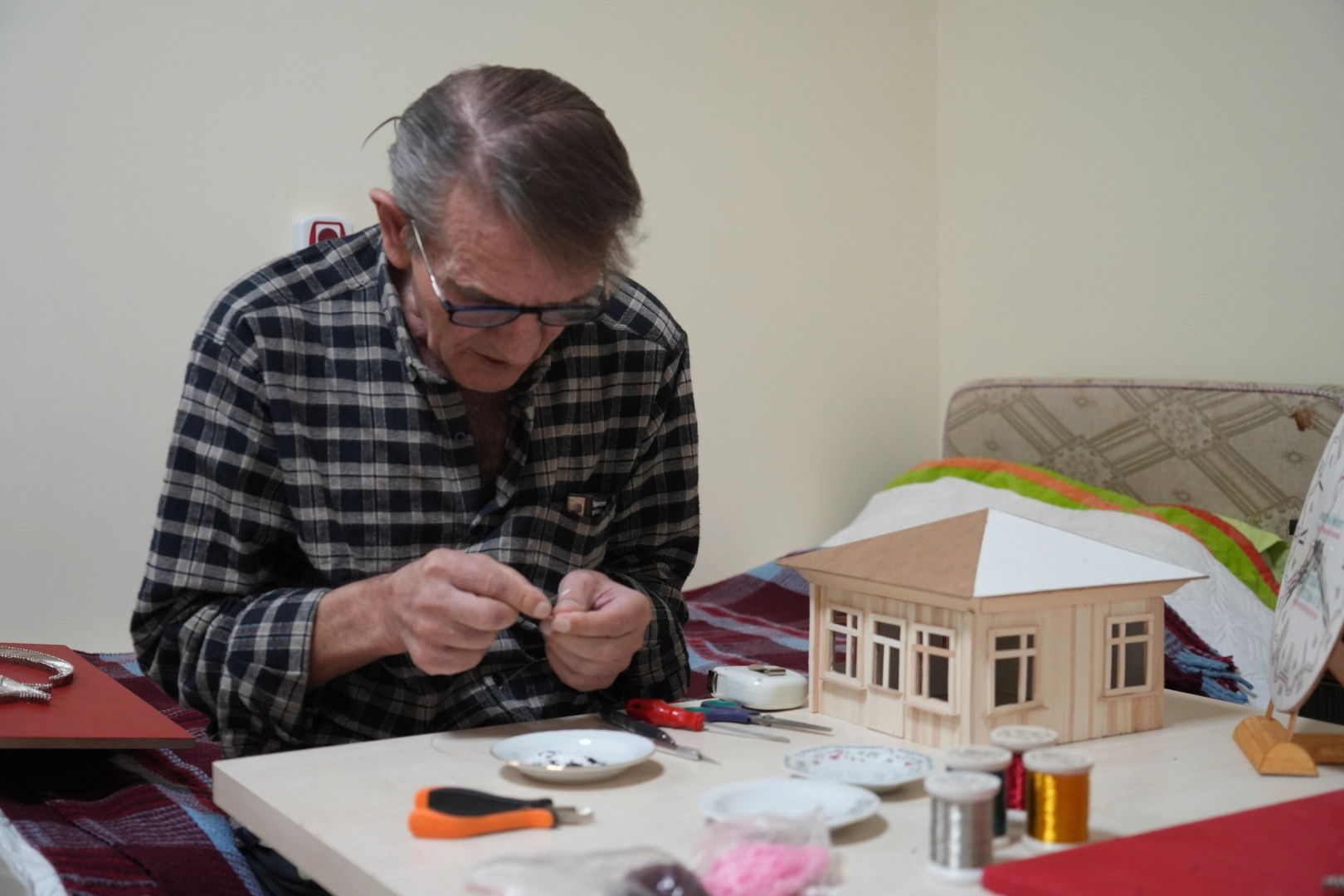 Kemah’taki huzurevinde açılan atölyeye merak edip gittiğini anlatan Alemdar, yıllar önce askerde kibritten gemi yaptığını kurs hocasına söylediğini belirterek, "Hocama 50 sene önce askerde kibritten gemi yaptığımı söyledim. ‘Ne lazım ’ diye sordu. Karton ve tutkal lazım dedim. Malzemeler masanın üzerindeydi, hemen başladık. Yapacağım gemi maketinin modelini kartondan çıkardım. Kibrit ve kibrit kutularıyla gemiyi yaptık" diye konuştu. "Bu kurs benim için ilaç oldu" İlk çalışmasının ardından farklı maketler de yapmaya başladığını belirten Alemdar, "Hoca bana, ‘Bülent amca ev yapabilir misin?’ dedi, bir resim gösterdi. Tamam dedim, evi yaptım. Sonra cami resmi gösterdi, camiyi yaptık derken artık atölyeden çıkamaz olduk. Bu kurs benim için ilaç oldu" ifadelerini kullandı. "Elim tuttuğu müddetçe durmak yok" Erzincan'dan Bayburt’a döndükten sonra da öğrendiği el sanatlarını bırakmadığını söyleyen Alemdar, filografiyle Türk bayrakları yaptığını, takı tasarımı ve maket çalışmalarına devam ettiğini kaydetti. Üretmenin kendisine güç verdiğini dile getiren Alemdar, "Maket için uygun takımım olsa yapamayacağım bir şey yok. Elim tuttuğu müddetçe durmak yok" dedi