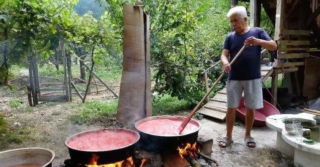 Tokat’ta, geleneksel yöntemlerle odun ateşinde saatlerce pişirilerek yapılan salçaya erkek eli değdi.