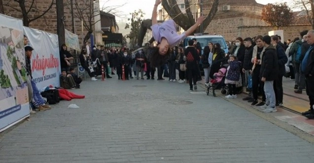 Merkez Osmangazi ilçesindeki Cumhuriyet Caddesi üzerinde yaşları 13 ile 18 arasında değişen Uludağ Üniversitesi Beden Eğitimi Fakültesi öğrencisi olan bir grup gencin müzik eşliğinde yaptığı akrobatik gösteri vatandaşın ilgisini çekti. Yaptıkları adrenalin dolu gösteri ile harçlık toplamak isteyen gençlere toplanan kalabalık destek verdi.