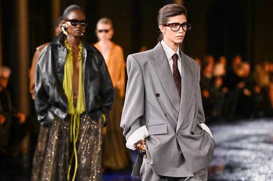 Gümüş, altın ve bronz tonlarında kumaşlar gece şıklığında dikkat çekiyor. Parlak ceketler, elbiseler ve çantalar sokak modasına da yansıyor.