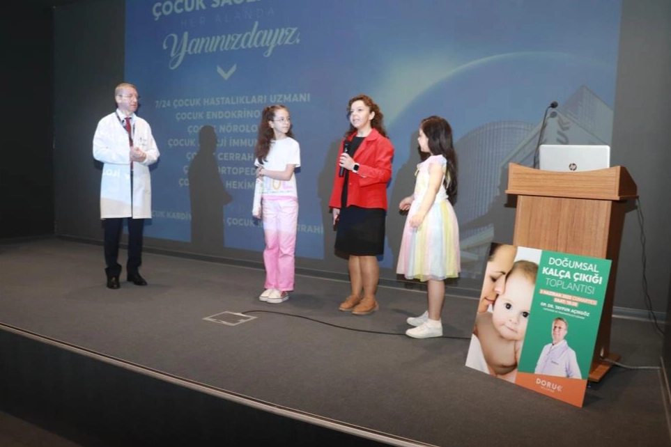 Gelişimsel kalça çıkığı kız çocuklarında erkeklere oranla daha sık görüldüğünü de sözlerini ekleyen Op. Dr. Tayfun Açıkgöz, erken teşhis ve tedavinin önemine dikkat çektiği konuşmasını ultrasonografik taramanın altını çizerek şöyle sürdü: "Riskli bebeklerde ve klinik şüphe durumlarında erken ultrasonografi gerekliyse de kalça ultrason tetkikinin 4’üncü ve 6’ncı haftalarda yapılması önerilmektedir. Ailelere bebeklerini kundak yapmamalarını, özellikle risk grubunda bulunan bebeklerde kalça ultrason tetkiki mutlaka yaptırmaları, gelişimsel kalça çıkığı hastalığında erken dönemlerde uygulanan tedaviler ile iyi neticelerin alınması sebebiyle eğer hastalık teşhis edilirse tedavisine başlanması hususunda gecikmemeleri ve ihmalde bulunmamaları önerilir.” Gelişimsel kalça çıkığı hastalığın belirtilerine de değinen Op. Dr. Tayfun Açıkgöz, "Bacak büklümlerinin sayıca ve derinlikçe eşit olmaması, bacakların yanlara açılmasının kısıtlı oluşu, bükülmüş olan dizlerin aynı seviyede bulunmaması, bacakta kısalığın bulunması olarak sayabiliriz. Yürüme sonrası döneminde ise çocuğun yürümesinin gecikmesi, yürümede aksama ve bacakta kısalığın bulunuşu bebeklerde kalça çıkığı hastalığının belirtileridir” diye konuştu. Hastane Genel Müdürü Uzm. Dr. Ayhan Kalyoncu ise, "Doruk hastaneleri 25 yıldır çocuk sağlığı konusunda Bursa’da öncü bir kuruluştur. Her zaman çocuk sağlığını ön plana koyduk. Ortopedi alanında bugün yapılan ve doğumsal kalça çıkığı hakkında farkındalık oluşturmak istedik” dedi.