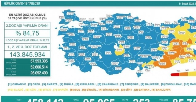 Sağlık Bakanlığı tarafından Türkiye’nin yeni korona virüs tablosu açıklandı 10 Şubat’ta açıklanan 24 saatlik verilere göre 95 bin 065 vaka tespit edildi. Virüs nedeniyle hayatını kaybedenlerin sayısı 253 oldu. Bir günde toplam 458 bin 142 test yapılırken, iyileşen hasta sayısı 85 bin 758 olarak kaydedildi. Sağlık Bakanlığı tarafından açıklanan tabloda, 2 doz aşılama verilerine de yer verildi. En az 2 doz aşı olmuş 18 yaş üzeri nüfusu kapsayan verilere göre Türkiye’de 2. doz aşılama ortalama yüzde 84,75 oldu. 1. doz ortalaması yüzde 92,72 olurken, 1., 2. ve 3. doz aşısını olan vatandaş sayısı toplamda 143 milyon 845 bin 934 ’e yükseldi.