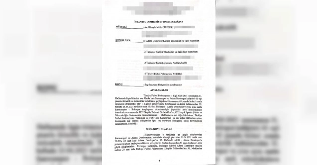 “Türkiye Futbol Federasyonu 1. Ligi 2020-2021 sezonunun 31. Haftasında ligin bitimine son 3 hafta kala Samsunspor ve Adana Demirspor kulüpleri 61 eşit puanla ikincilik ve üçüncülük koltuklarını paylaşırken Giresunspor 63 puanla birinci sırada mücadele etmektedir. TFF 1. Ligi’nin şampiyonunu belirleyecek en kritik haftalarından 32. haftada 25 Nisan 2021 tarihinde saat 20:30’da Tuzlaspor - Adana Demirspor ve yine aynı saatte Samsunspor - Boluspor karşılaşması düzenlenmiştir. Şüpheliler anılı müsabakaların öncesinde ve sonrasında TFF Disiplin Talimatı 56. Maddesi’ne, 6222 sayılı Sporda Şiddet ve Düzensizliğin Önlenmesine İlişkin Kanunun 11. Maddesine ve sair diğer hükümlere, Türkiye Futbol Federasyonu Yetkilileri ise Türk Ceza Kanunu’nun 257. Maddesi ve sair diğer hükümlere aykırı davranarak suç işlemiş olduğundan işbu suç duyurusu dilekçesini savcılığınıza sunmaktayız.”