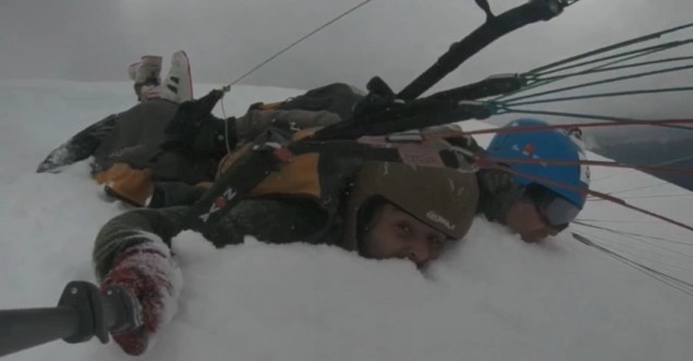 Artvin’in Şavşat ilçesinde karlı dağların eteklerinden havalanan yamaç paraşütü sporcuları muhteşem manzara eşliğinde göklerde süzülerek başarılı iniş yaptı.