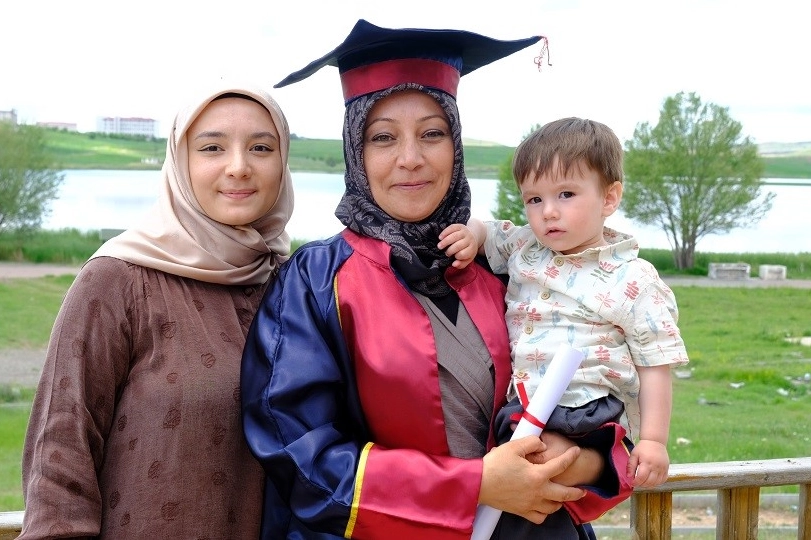 Sivas Cumhuriyet Üniversitesi Hafik Kamer Örnek Meslek Yüksekokulu öğrencilerine mezuniyet töreni düzenledi. Hafik Gölü’nde gerçekleşen mezuniyet törenine İlçe Kaymakamı Mürüvvet Yücel, Rektör Danışmanı Doç. Dr. Nevzat Balıkçıoğlu, akademisyenler, öğrenciler ve aileleri katıldı. Törende Çocuk Bakımı ve Gençlik Hizmetleri Bölümü, Raylı Sistemler İşletmeciliği Bölümü, Finans-Sigorta ve Bankacılık Bölümü ile Sağlık Kurumları İşletmeciliği Bölümü mezunlarına diplomaları verildi. Mezuniyette ilginç anlara da şehitlik edildi. Çocuk Bakımı ve Gençlik Hizmetleri Bölümü öğrencisi Nezahat Dağdeviren mezuniyet kutlamasına kucağındaki torunu ile birlikte katıldı. Cüppe giyip kep atan Dağdeviren, diplomasını da kucağında torunu ile aldı.