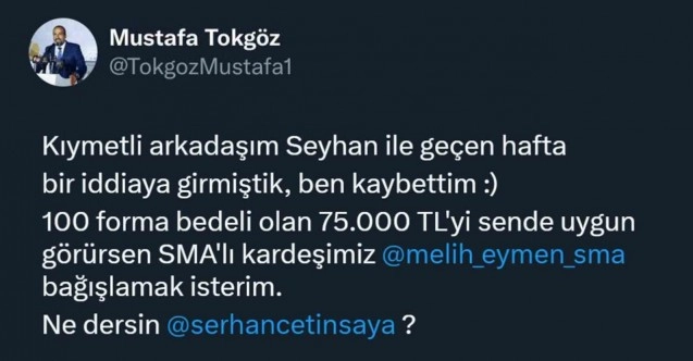 Mustafa Toköz, kaybettiği iddia sonrasında 100 forma bedeli olan 75 bin TL’yi SMA hastası Melih Eymen Ceylan’ın hesabına yatırmayı teklif etti. Çetinsaya’nın onayı ile forma parasının Melih Eymen’in hesabına yatırılması kararlaştırıldı.