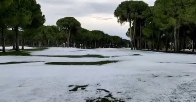 Antalya’nın Serik ilçesinde yaklaşık 20 dakika dolu yağışı etkili oldu. Dolu nedeniyle golf ve futbol sahaları beyaza bürünürken, herhangi bir zararın oluşmadığı öğrenildi.