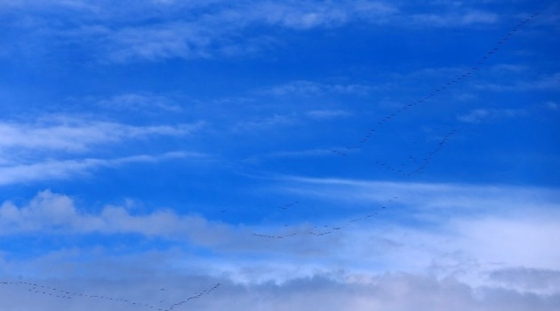 Kuşların hareket yolu üzerinde bulunan Köprü köyde turnaların düzen halinde uçuşları görüntülendi. ‘V’ şeklinde uçan göçmen kuşlar, bu sayede seyahatleri esnasında iletişim ve uyumu kolaylıkla sağlarken enerji tüketimini de en az seviyede tutuyor. Turna çiftleri beslenecekleri güvenli bir yer bulduktan sonra yuva kurup yumurtan çıkan yavrularına bakıyor. Göçmen kuşlar sonbahar göçünde de aynı güzergah üzerinden Afrika’ya geri dönerken yavruları da kendilerinden ayrılıyor.