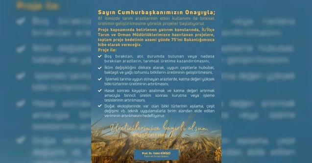Tarım ve Orman Bakanı Vahit Kirişci, sosyal medya hesabından yaptığı paylaşımda, “81 ilimizde tarım arazilerinin etkin kullanımı ile bitkisel üretimin geliştirilmesine yönelik projeler başlatıyoruz. Proje kapsamında belirlenen yatırım konularında, il/ilçe Tarım ve Orman Müdürlüklerimizce hazırlanan projelere, toplam proje bedelinin azami yüzde 75’ini Bakanlığımızca hibe olarak vereceğiz. Proje ile boş bırakılan, atıl durumda bulunan veya nadasa bırakılan arazilerin, tarımsal üretime kazandırılması. İklim değişikliğini dikkate alarak, uygun çeşitlerle hububat, baklagil ve yağlı tohumlu bitkilerin üretiminin geliştirilmesi. İşlemeli tarıma uygun olmayan arazilerde, katma değeri yüksek bitki türlerinin Üretiminin artırılması. Hasat sonrası kayıpları azaltmak ve katma değeri artırmak amacıyla birincil üretim sonrası kurutma veya isleme tesislerinin artırılması ve doğal ekolojilerinde var olan bitki türlerinin aşılama, çeşit değişimi ve benzeri teknik uygulamalarla birim alandan elde edilen veriminin artırılması hedefleniyor." ifadelerini kullandı.