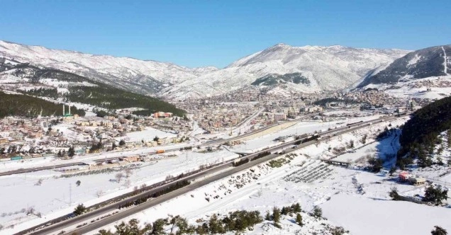 Osmaniye’de etkili olan yoğun kar yağışı sonrası beyaza bürünen Bahçe ilçesi drone ile havadan görüntülendi.