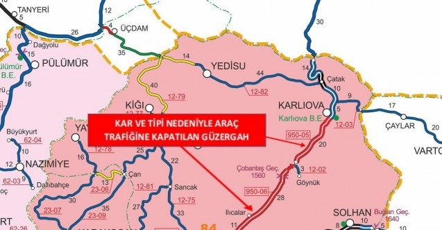 Bingöl Valiliğinden yapılan açıklamaya göre, yoğun kar yağışı nedeniyle Bingöl Erzurum karayolu araç trafiğine kapatıldığı belirtildi. Açıklamada, ’’Bingöl-Erzurum devlet yolunun 29-49 ile 0-39 kilometreleri arası yoğun kar yağışı ve tipi nedeniyle saat 12.45 itibariyle araç trafiğine kapatılmıştır" denildi.