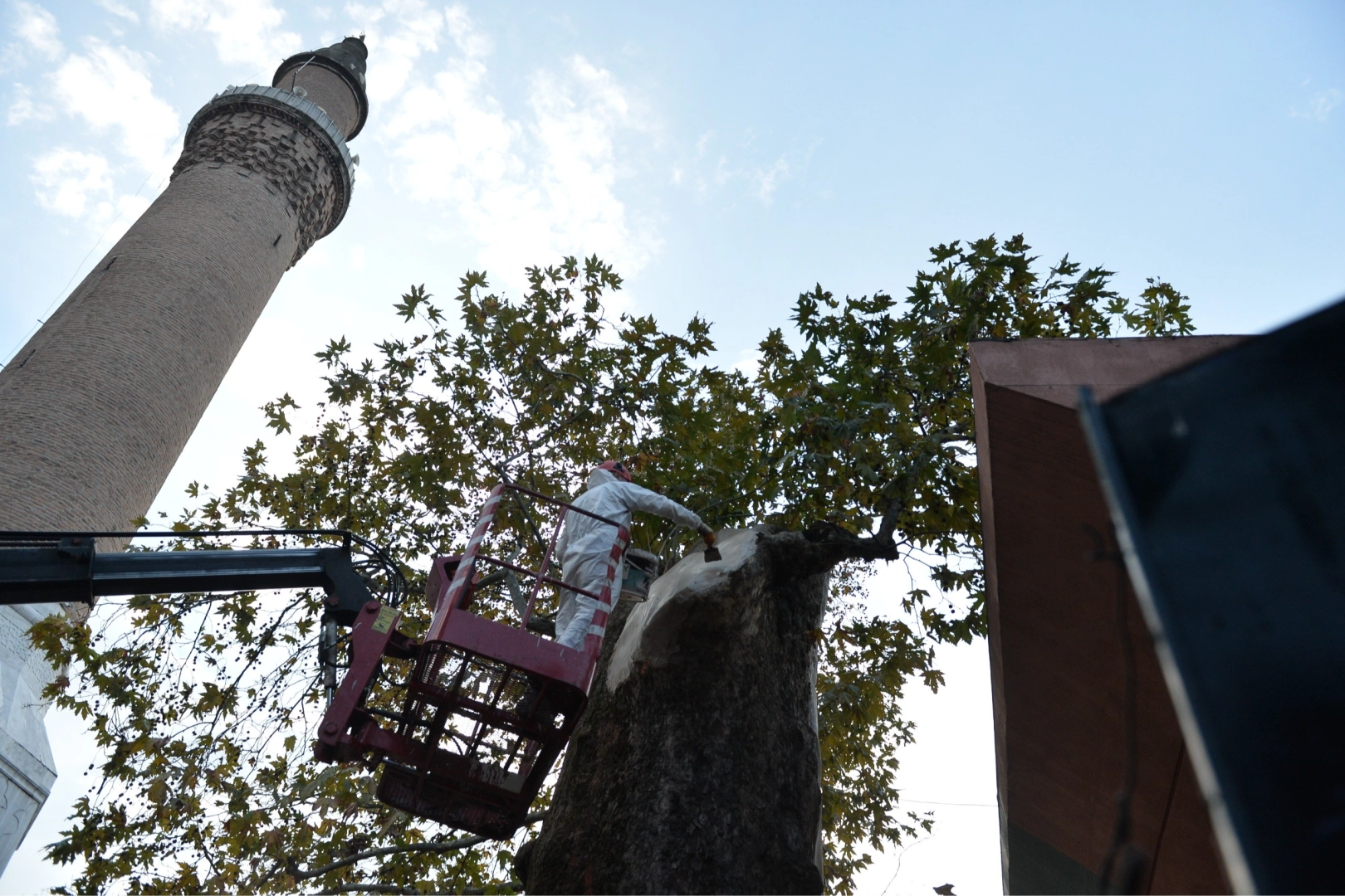 Bursa Ulu Cami’nin avlusunda yer alan ve henüz bilinmeyen bir nedenle büyük dalı kopan 346 yaşındaki asırlık çınar ağacı, Büyükşehir Belediyesi ekiplerinin bakım ve restorasyon çalışmalarıyla geleceğe taşınıyor.