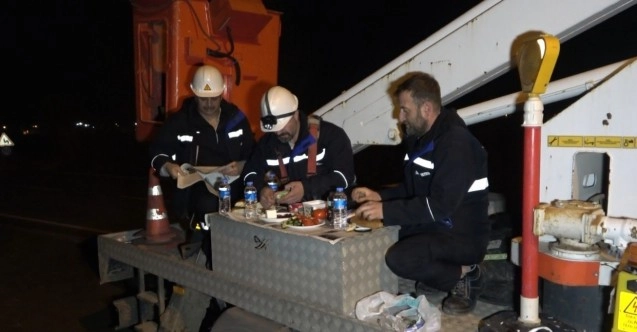 Mevsim geçişlerinde etkili olan fırtınanın zarar verdiği elektrik nakil hatlarını onaran Vangölü Elektrik Dağıtım Anonim Şirketi (VEDAŞ) ekipleri kamyonet kasasında sahur yaptı.