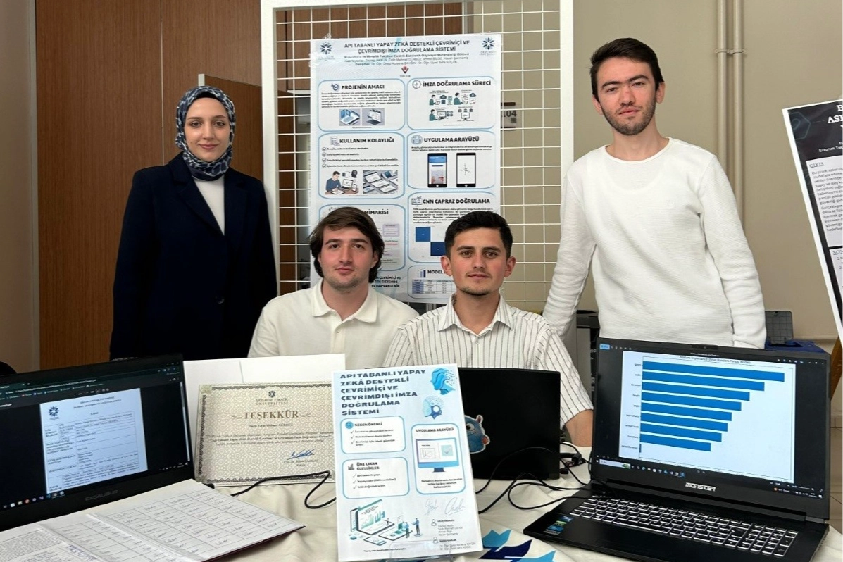 Projeleri hakkında bilgi veren Ahmet Bilge, yazılımın özellikle kamu kurumları, bankacılık, hukuk, sağlık ve güvenlik gibi sahtecilik riski yüksek alanlarda kullanılabileceğini belirtti. Bilge, "Sistem, hem çevrimiçi hem de çevrimdışı imzaları doğrulayabilen iki ayrı yöntem sunuyor. Çevrimiçi yöntemde kullanıcı dijital ortamda dokunmatik ekran aracılığıyla imzasını atarken, sistem hız, basınç, yön, eğim ve zamanlama gibi biyometrik verileri kaydederek analiz ediyor. Derin öğrenme modeli tarafından yapılan bu analiz sonucunda doğrulama sonucu kullanıcıya anında iletiliyor. Çevrimdışı yöntemde ise daha önce atılmış veya fiziksel belgelerde yer alan imzaların görüntüsü sisteme yükleniyor. Bu görüntüler, cihaz galerisi veya doğrudan kamera ile alınabiliyor. Görüntü işleme algoritmalarıyla analiz edilen imzalar, referans imzalarla karşılaştırılarak doğrulanıyor. Her iki yöntemde de sonuçlar, kullanıcıya açık ve anlaşılır şekilde sunuluyor" şeklinde konuştu. "Amaç, güvenlik ve doğruluğunu artırmak" Fatih Mehmet Gürbüz ise, sistemin temel amacının güvenlik ve işlem doğruluğunu artırmak olduğunu söyledi. Gürbüz, "Yapay zekâ destekli algoritmalar sayesinde manuel süreçleri otomatik hale getirdik. Bu sayede hem çevrimiçi hem de çevrimdışı imzaların güvenle doğrulanması mümkün hale geldi. Proje, özellikle yüksek güvenlik gerektiren alanlarda işlem hızını ve doğruluğunu artırarak sahteciliğe karşı etkili bir çözüm sunuyor" diye konuştu.