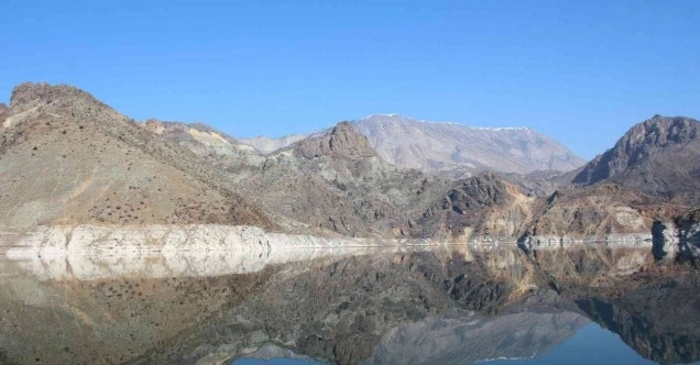 Erzurum’un Oltu ilçesindeki Ayvalı Barajı’nda berrak suya dağların yansıması kartpostallık görüntüler oluşturdu.