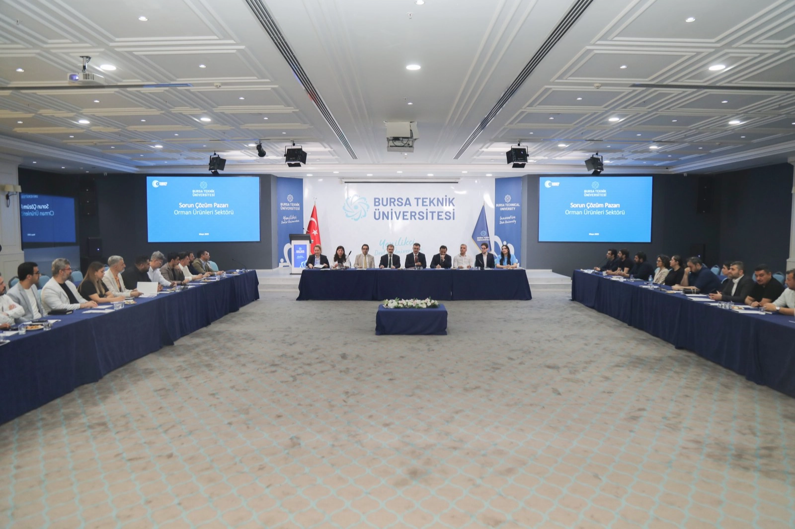 Rektör Prof. Dr. Naci Çağlar ve konunun uzmanı akademisyenleriyle bir araya gelen firma temsilcileri, sektördeki sorunları paylaşarak, BTÜ’ye çözüm odaklı bakış açısı için teşekkür etti.“Sanayiyi güçlendiren, sanayiden güç alan üniversite” hedefiyle çalışmalarını sürdüren Bursa Teknik Üniversitesi (BTÜ), Türkiye’de bir ilk olan “Sorun Çözüm Pazarı” projesini 2024’ten itibaren uyguluyor. Sektörlere özel toplantılar düzenleyerek, ilk ağızdan sorunları dinleyen BTÜ akademisyenleri, saniyeye nefes aldıracak projeler üretiyor. Otomotivin ardından tekstil sektörü ile süren Sorun Çözüm Pazarı, bu kez orman ürünleri sektörünün temsilcilerini ağırladı. Üniversite-Sanayi İşbirliği Geliştirme Uygulama ve Araştırma Merkezi (BTÜ-SAN) tarafından, Mimar Sinan Yerleşkesi Turkuaz Salon’da gerçekleşen Sorun Çözüm Pazarı lansmanına; BTÜ Rektörü Prof. Dr. Naci Çağlar, Rektör Yardımcısı Prof. Dr. Sinan Uyanık, Bursateknopark Genel Müdürü Prof. Dr. Ayşe Bedeloğlu ve akademisyenler, orman ürünleri sektörünün temsilcileri ile bir araya geldi. Toplantıda, firma temsilcileri tek tek söz alarak sektörde karşılaştıkları sorunları ve BTÜ’den beklentilerini dile getirdi.