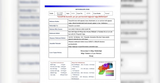 Meteoroloji 13. Bölge Müdürlüğü, Tunceli merkezde kuvvetli, kuzey ilçelerde ise yer yer çok kuvvetli sağanak yağış, yüksek kesimlerde ise karla karışık yağmur beklendiğini açıkladı. Ovacık, Pülümür ve Nazimiye’de yer yer çok kuvvetli yağışın etkili olmasının beklendiği kaydedilen açıklamada, vatandaşlardan, ani sel, su baskını, ulaşımda aksamalar, heyelan gibi olumsuzluklara karşı dikkatli olmaları istendi.