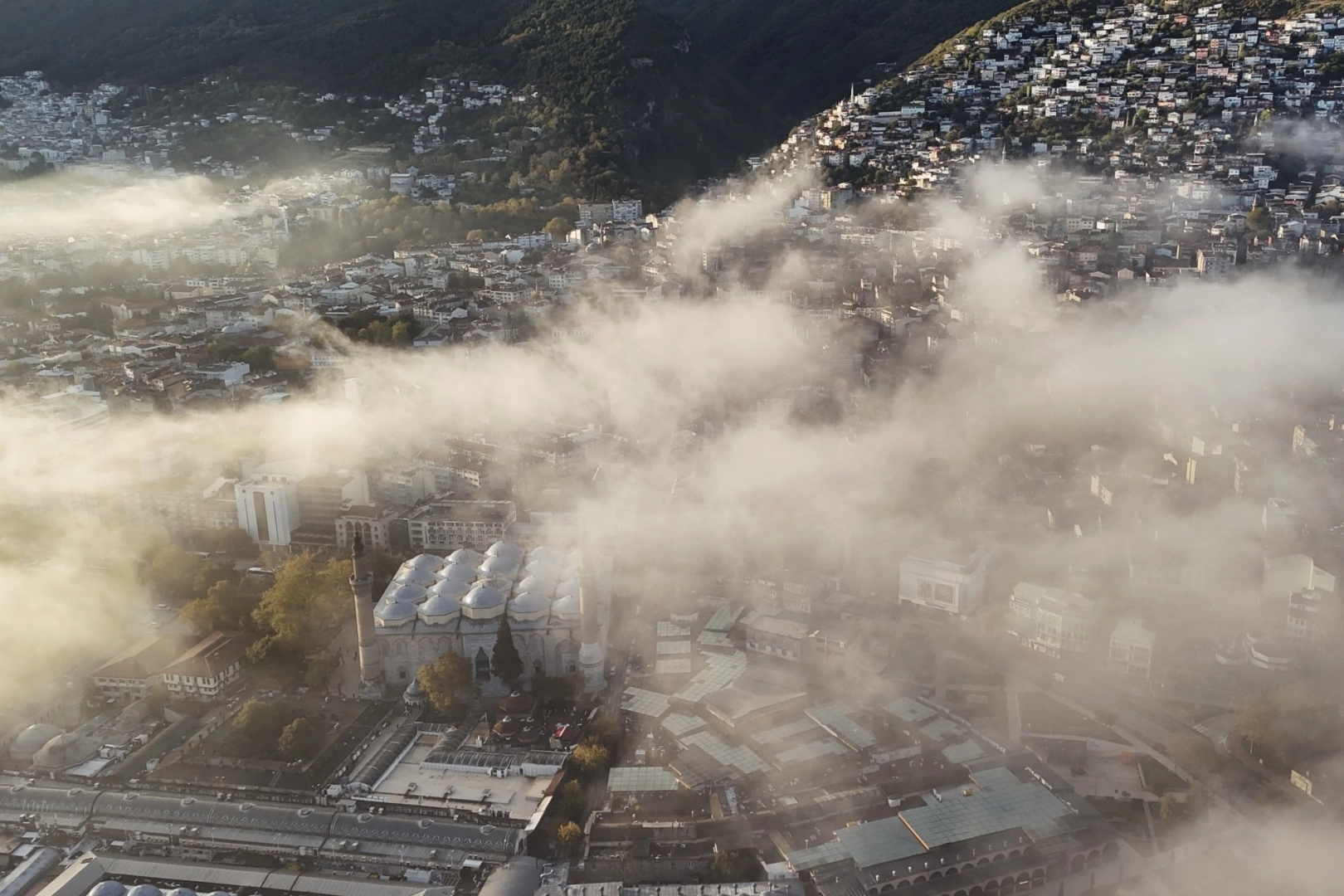 Drone ile havadan görüntülenen Bursa'da binalar sis bulutlarının arasında kaybolurken, pamuklara bürünmüş bir Bursa gibi izleyenleri mest etti. Bursa'nın simgesi olan Ulu Cami, Tophane ve önemli tarihi mekanların sis altındaki görüntüleri büyüledi. Ortaya çıkan görsel şölen, izleyenler tarafından büyük beğeni kazandı.