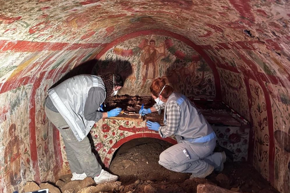 Mezarın kuzey duvarına bitişik klinein pişmiş toprak kare levhalarla kaplı olduğu, ölülerin bu levhaların üzerine yatırıldığı belirlendi. Klinein ardındaki kuzey duvarında ise nadir görülen 'Çoban İsa' figürü dikkat çekti.