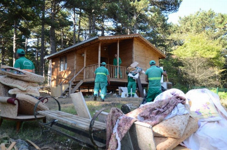 Uludağ'ın adeta her santimini mercek altına alarak ruhsatsız yapıları tespit eden belediye ekiplerinin gözünden, Hüseyinalan Mahallesi’nde çam ağaçlarının arasına gizlenmiş şekilde inşa edilen ahşap ev de kaçmadı.