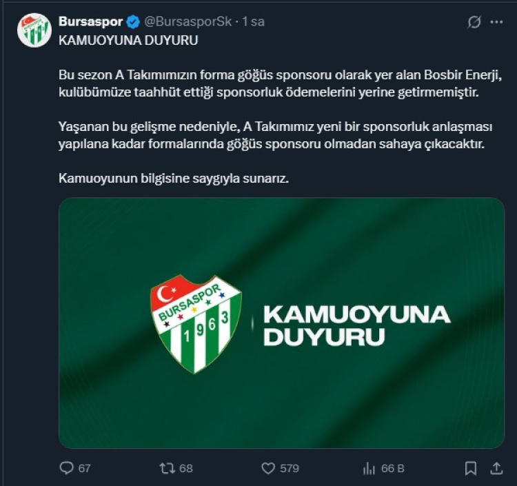 Kulüpten yapılan resmi açıklamada şu ifadelere yer verildi: “Bu sezon A Takımımızın forma göğüs sponsoru olarak yer alan Bosbir Enerji, kulübümüze taahhüt ettiği sponsorluk ödemelerini yerine getirmemiştir. Yaşanan bu gelişme nedeniyle, A Takımımız yeni bir sponsorluk anlaşması yapılana kadar formalarında göğüs sponsoru olmadan sahaya çıkacaktır. Kamuoyunun bilgisine saygıyla sunarız.”