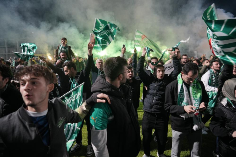 Deplasmanda Artin Hopaspor'u 2-1 mağlup edip lig bitimine 2 hafta kala şampiyonluğunu ilan eden Bursaspor maçın ardından Özlüce İbrahim Yazıcı Tesisleri'ne geldi. Yeşil-beyazlı taraftarlar takımı tesis etrafında meşaleler ve tezahüratlarla karşıladı. Yoğun ilgiyle karşılaşan takımın otobüsü kalabalıktan ilerleyemedi. Tesise çıkan kulüp yöneticileri, teknik heyet ve futbolcular, taraftarı el sallayarak selamladı. Besteler eşliğinde şampiyonluğu kutlayan takım ve taraftarlar eski teknik direktör Pablo Martin Batalla'ya da selam gönderdi.