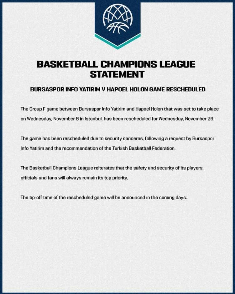 Basketbol Şampiyonlar Ligi’nde çarşamba günü oynanacak olan Bursaspor İnfo Yatırım - Hapoel Holon müsabakası, güvenlik sebepleri nedeniyle 29 Kasım Çarşamba gününe ertelendi. Yapılan açıklamada, Bursaspor ve Türkiye Basketbol Federasyonu’nun tavsiyesi üzerine bu kararın alındığı belirtildi. Ayrıca açıklamada; oyuncuların, emniyet yetkililerinin ve taraftarın güvenliğinin, Basketbol Şampiyonlar Ligi’nde her zaman ön planda tutulacağı ifadeleri yer aldı.