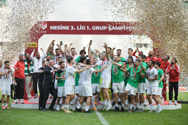 Nesine 3,.Lig 1.Grup’ta şampiyonluğunu geçtiğimiz hafta garantileyen Bursaspor, şampiyonluk kupasını dün Bursa’da oynadığı Bornova 1877 maçı sonrasında aldı. Evinde oynadığı son maçını 4-1 kazanan ve yeni bir seyirci rekoru kıran yeşil beyazlı ekip, maçın bitiş düdüğünden sonra da sahaya kurulan platformda madalyalarını ve şampiyonluk kupasını aldı.