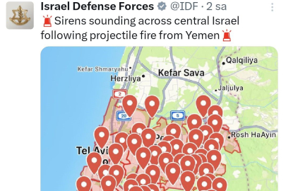 İsrail ordusu Gazze Şeridi'ndeki katliamlarını sürdürürken, Yemen'den İsrail’e bir misilleme saldırısı daha yapıldı. İsrail Savunma Kuvvetleri’nden (IDF) yapılan açıklamada, Yemen’den fırlatılan bir füze nedeniyle ülkenin birçok bölgesinde sirenlerin çaldığı kaydedildi. Füzenin hava savunma sistemi tarafından engellendiği belirtilirken, İsrail basını saldırı nedeniyle herhangi bir hasar meydana gelmediğini duyurdu. Son gelişme ile birlikte Yemen’deki İran destekli Husilerin son 24 saatte İsrail’e yönelik gerçekleştirdiği füze saldırılarının sayısı en az 2’ye yükselmiş oldu.