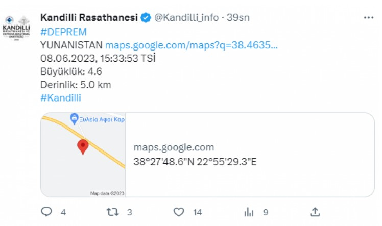 Kandilli Rasathanesi'nden edinilen bilgiye göre, Yunanistan'da 4.6 büyüklüğünde deprem meydana geldi.