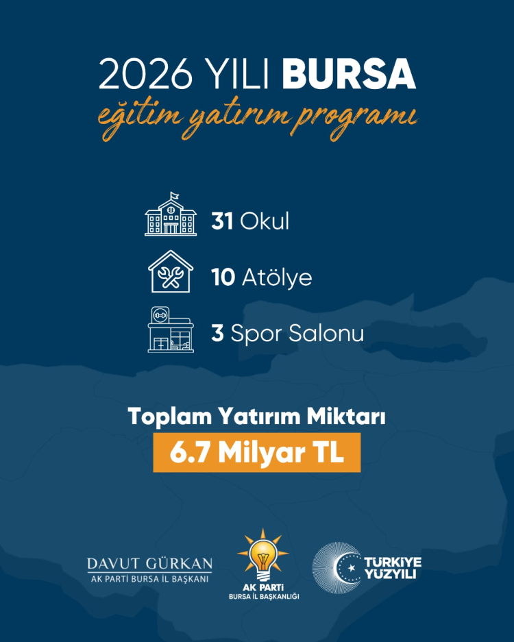 AK Parti Bursa İl Başkanı Davut Gürkan, Bursa’da Devlet Yatırım Programı’na alınan 31 okul projesine ilişkin yaptığı açıklamada, “Bursa’mızda eğitime yönelik yatırımlarımız kararlılıkla sürüyor. 2025 yılında hazırlıklarına başlanan ve 2026 yılı yatırım programına alınan ilimiz genelinde 680 derslikli 31 okul inşa edilecek. Modern ve depreme dayanıklı yeni eğitim yuvalarını etap etap 2028 yılına kadar tamamlamayı hedefliyoruz. Yık-yap ve yeni okul inşaatlarımız kapsamında 10 atölye ve 3 spor salonunu da öğrencilerimizin hizmetine sunacağız. Anaokullarından meslek liselerine kadar farklı kademelerde 10 ilçemizde yapılacak eğitim kurumlarımızı 6,7 milyar liraya yaklaşan büyük bir bütçe ile hayata geçiriyoruz.” dedi.