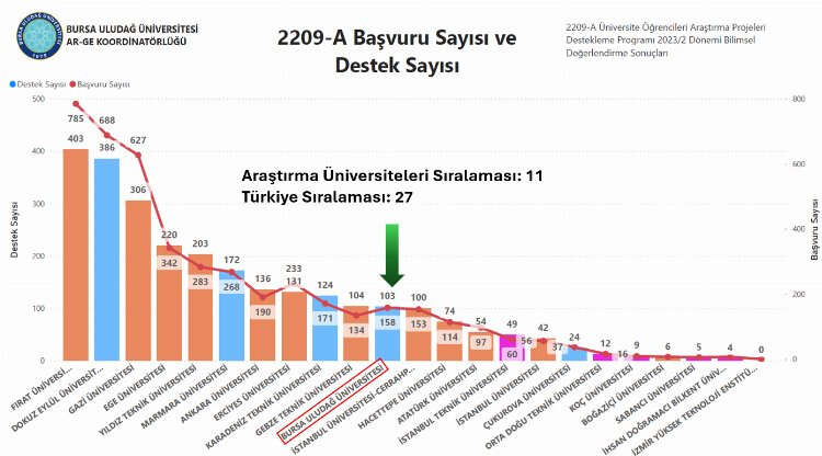 2209-A ve 2209-B Üniversite Öğrencileri Araştırma Projeleri Destekleme Programı 2023/2 Dönemi Bilimsel Değerlendirme Sonuçlarına göre en fazla başvuru yapan ve destek alan üniversiteler belli oldu. Başvuru yapan 197 üniversite içerisinde 27. sırada bulunan BUÜ, araştırma üniversiteleri arasında ise 11. sırada yer aldı. 2209-A ve 2209-B kategorisinde toplam 158 başvuru yapan BUÜ’lü öğrencilerin 103 projesi kabul aldı.