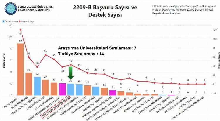 Bursa Uludağ Üniversitesi, TÜBİTAK 2209-B kategorisinde ise çok daha başarılı sonuçlar aldı. 103 üniversite arasında proje destek oranları açısından 14. sırada bulunan BUÜ, araştırma üniversiteleri arasında 7. oldu. Bu kategoride BUÜ’nün yaptığı 43 proje başvurusunun 20’si destek almayı başardı. Bu projelerin 18’i yine Mühendislik Fakültesi’nden gelirken, 2 proje de Fen-Edebiyat Fakültesi’nden çıktı.