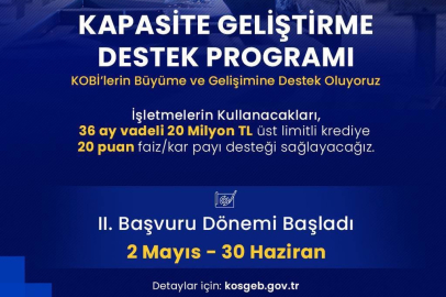 Sanayi ve Teknoloji Bakanı Mehmet Fatih Kacır, sosyal medya hesabı üzerinden yaptığı açıklamada üretimin, istihdamın ve ihracatın öncüsü KOBİ’leri büyütmek için KOSGEB Kapasite Geliştirme Destek Programı’nda 2. başvuru döneminin başladığını belirterek, "20 milyon lira üst limitli, 36 ay vadeli finansman için 20 puanlık faiz/kâr payı desteği sağlıyoruz. Bu yılın ilk başvuru döneminde 19,4 milyar TL yatırım tutarıyla 877 işletmenin projesini destekliyoruz. Hedefimiz işletmelerimizin dijitalleşmeden verimliliğe, ihracattan sürdürülebilirliğe her alanda güçlenmesini sağlamak ve rekabetçiliğini artırmak. Daha güçlü, daha üretken Türkiye için KOBİ’lerimizin yanındayız" dedi. Bugün başlayan başvurular, 30 Haziran tarihine kadar yapılabilecek. Detaylara http://kosgeb.gov.tr internet adresinden ulaşılabilecek.