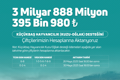'Küçükbaş hayvancılık kuzu/oğlak desteği' ödemeleri çiftçilerin hesaplarına, kimlik kartlarının son hanesi 6-8, VKN son hanesi 1-3-5-6-7-8-9 olanların 26 Mayıs saat 18.00'den itibaren aktarılacağı, kimlik kartlarının son hanesi 0-2-4, VKN son hanesi 0-2-4 olanların ise 30 Mayıs saat 18.00'den itibaren aktarılacağı bildirildi.