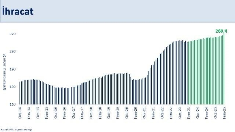 "İhracat temmuzda yıllık yüzde 11 artarak tarihimizin en yüksek aylık seviyesine ulaştı. Yıllık ihracat 269,4 milyar dolara yükselirken, ithalat geçen aya göre sınırlı bir artışla 357,7 milyar dolar gerçekleşti. Küresel ekonomideki belirsizliklere rağmen bu güçlü performans, ihracatçılarımızın dinamizmi ile ürün ve pazar çeşitlendirmedeki başarımızın somut bir göstergesi oldu. Dış ticaretteki bu tablo, güçlü hizmet gelirleri, sürdürülebilir cari açık ve sağlıklı büyüme dinamiğine işaret etmektedir. Bu ivmeyi koruyarak, Türkiye’nin küresel tedarik zincirindeki konumunu her geçen gün daha da ileriye taşımak için makro finansal istikrarı pekiştiren, katma değeri yüksek üretim ve inovasyon odaklı dönüşüm çalışmalarımıza kararlılıkla devam edeceğiz."