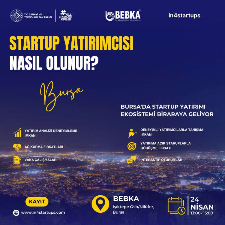 Girişimcilerle yatırımcıları bir araya getiren in4startups dijital platformu, Bursa Eskişehir Bilecik Kalkınma Ajansı (BEBKA) ev sahipliğinde "Startup Yatırımcısı Nasıl Olunur?" başlıklı bir program düzenliyor. Programda startup yatırımcılığı konusunda bilgi sunumları, başarılı startup yatırım süreçlerinin vaka anlatımı ve yatırıma açık startupların sunumları gerçekleştirilecek. Program, başarılı yatırımcıların deneyimlerinden yararlanarak, yeni dönem startup yatırımcılarının yetiştirilmesine odaklanacak.