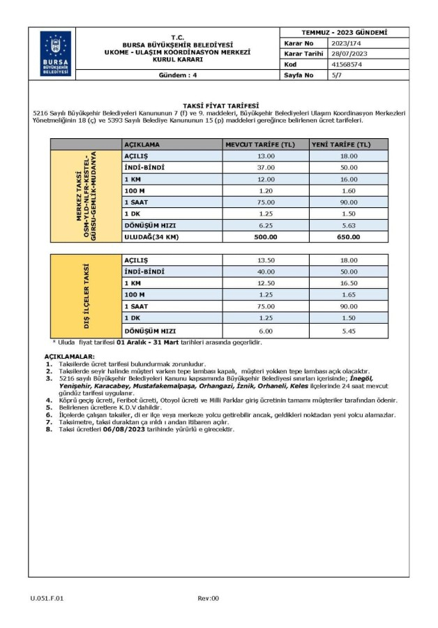 Bursa Büyükşehir Belediyesi Ulaşım Koordinasyon Merkezi (UKOME) kurul kararı ile Bursa'da taksi ücretlerine zam yapıldı.