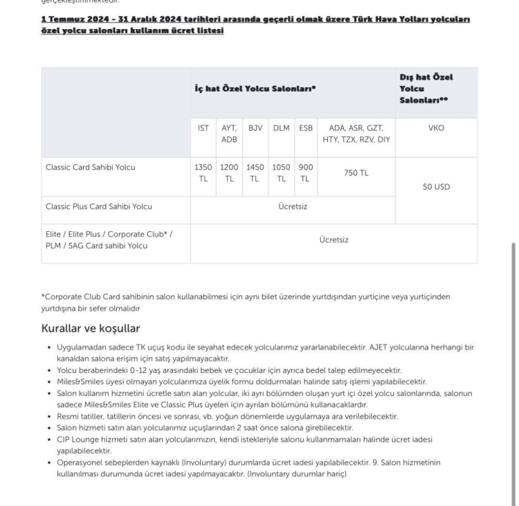 Türk Hava Yolları yaklaşık altı ayda bir özel yolcu salonlarına zam yapıyor. THY’nin, özel yolcu salonlarını kullanma ücretlerine yaptığı zamlar 1 Temmuz - 31 Aralık 2024 arasında geçerli olacak ve yeni yılda yeniden zamlanacak.