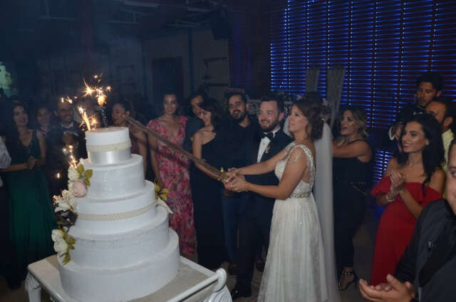 Genç çift alkışlar arasında düğün pastasını kesti.
