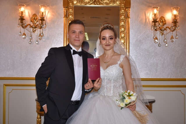 Tören sonrası genç çift evlilik cüzdanını nikah memurunun elinden aldı.